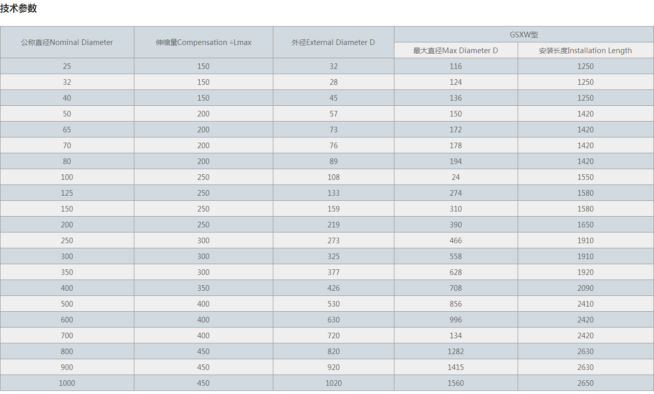 | 公稱直徑Nominal Diameter | 伸縮量Compensation △Lmax | 外徑External Diameter D | GSXW型 | |