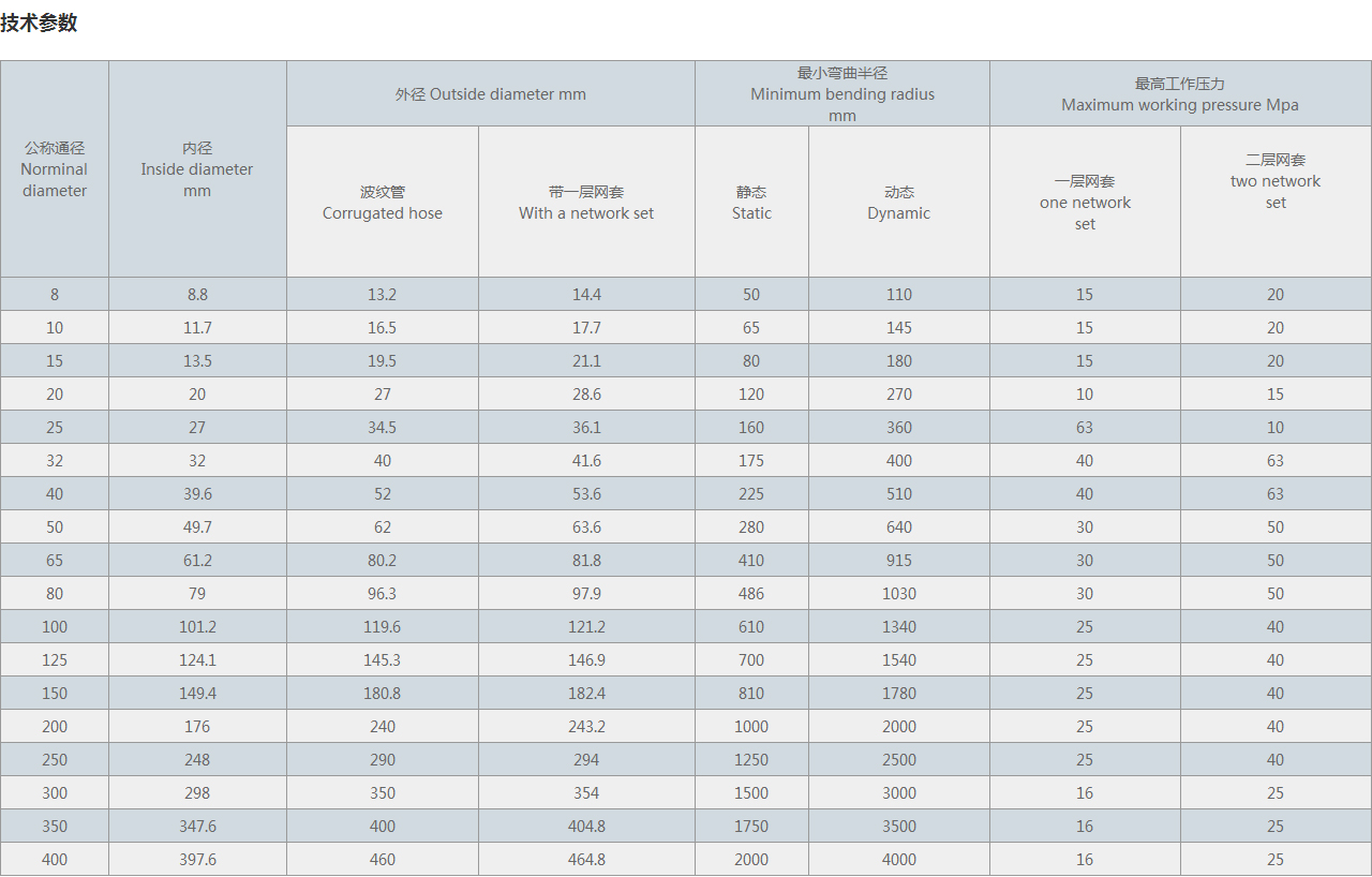 2.軟管管體為薄壁不銹鋼管體液壓成形,具有較強的柔韌性、伸縮性、彎曲和抗振能力強、編織網(wǎng)套的加強保護、使之具有更高的承壓能力。