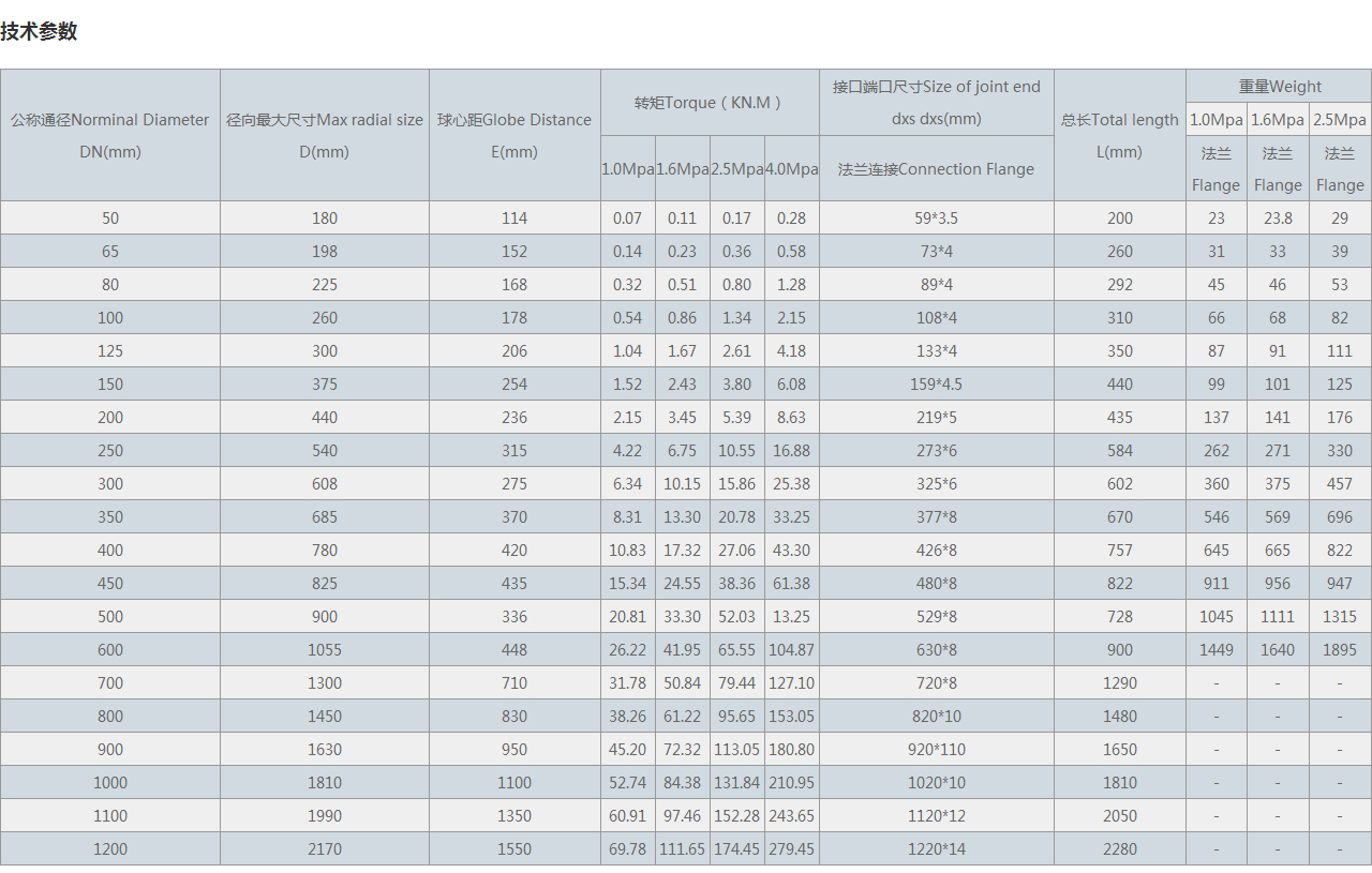 | 公稱通徑Norminal Diameter DN(mm) | 徑向很大尺寸Max radial size D(mm) | 球心距Globe Distance E(mm) | 轉(zhuǎn)矩Torque(KN.M) | 接口端口尺寸Size of joint end dxs dxs(mm) | 總長Total length L(mm) | 重量Weight | |||||
