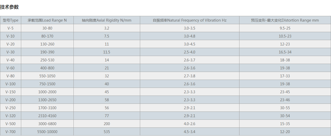 | 型號 | 荷重范圍(Kg) | 彈性系數(shù)(Kg/mm) | 適用撓度(mm) |