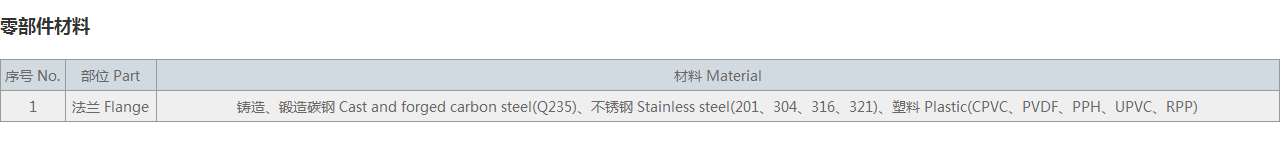 | 1 | 法蘭 Flange | 鑄造、鍛造碳鋼 Cast and forged carbon steel(Q235)、不銹鋼 Stainless steel(201、304、316、321)、塑料 Plastic(CPVC、PVDF、PPH、UPVC、RPP) |