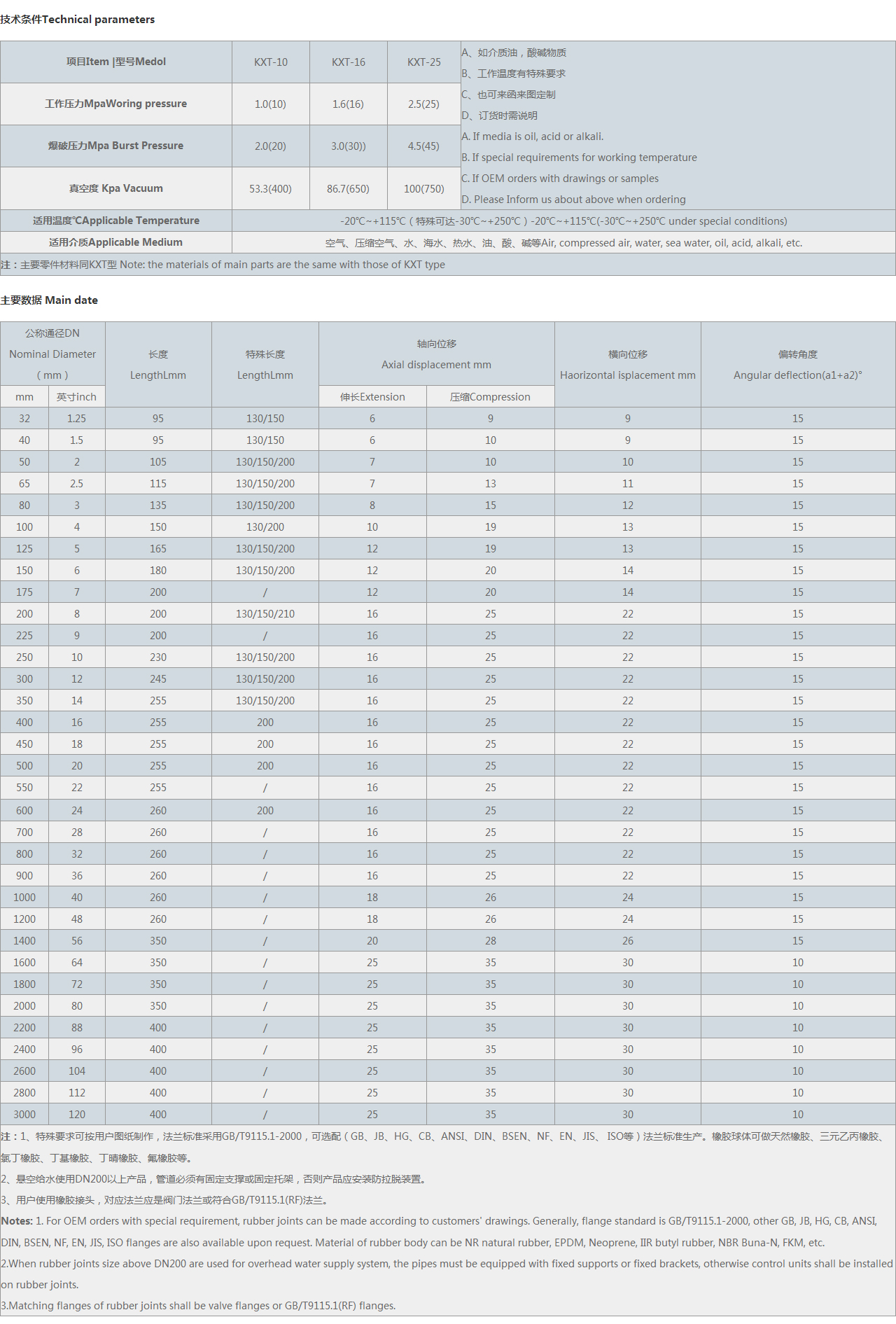 | 注:1、特殊要求可按用戶圖紙制作,可選配(GB、JB、HG、CB、ANSI、DIN、BSEN、NF、EN、JIS、 等)法蘭標(biāo)準(zhǔn)生產(chǎn)。橡膠球體可做天然橡膠、三元乙丙橡膠、氯丁橡膠、丁基橡膠、丁晴橡膠、氟橡膠等。 2、懸空給水使用DN200以上產(chǎn)品,管道必須有固定支撐或固定托架,否則產(chǎn)品應(yīng)安裝防拉脫裝置。 3、用戶使用橡膠接頭,對應(yīng)法蘭應(yīng)是閥門法蘭。 Notes: 1. For OEM orders with special requirement, rubber joints can be made according to customers' drawings. Generally, flange standard is , other GB, JB, HG, CB, ANSI, DIN, BSEN, NF, EN, JIS, flanges are also available upon request. Material of rubber body can be NR natural rubber, EPDM, Neoprene, IIR butyl rubber, NBR Buna-N, FKM, etc. 2.When rubber joints size above DN200 are used for overhead water supply system, the pipes must be equipped with fixed supports or fixed brackets, otherwise control units shall be installed on rubber joints. 3.Matching flanges of rubber joints shall be valve flanges or flanges. |