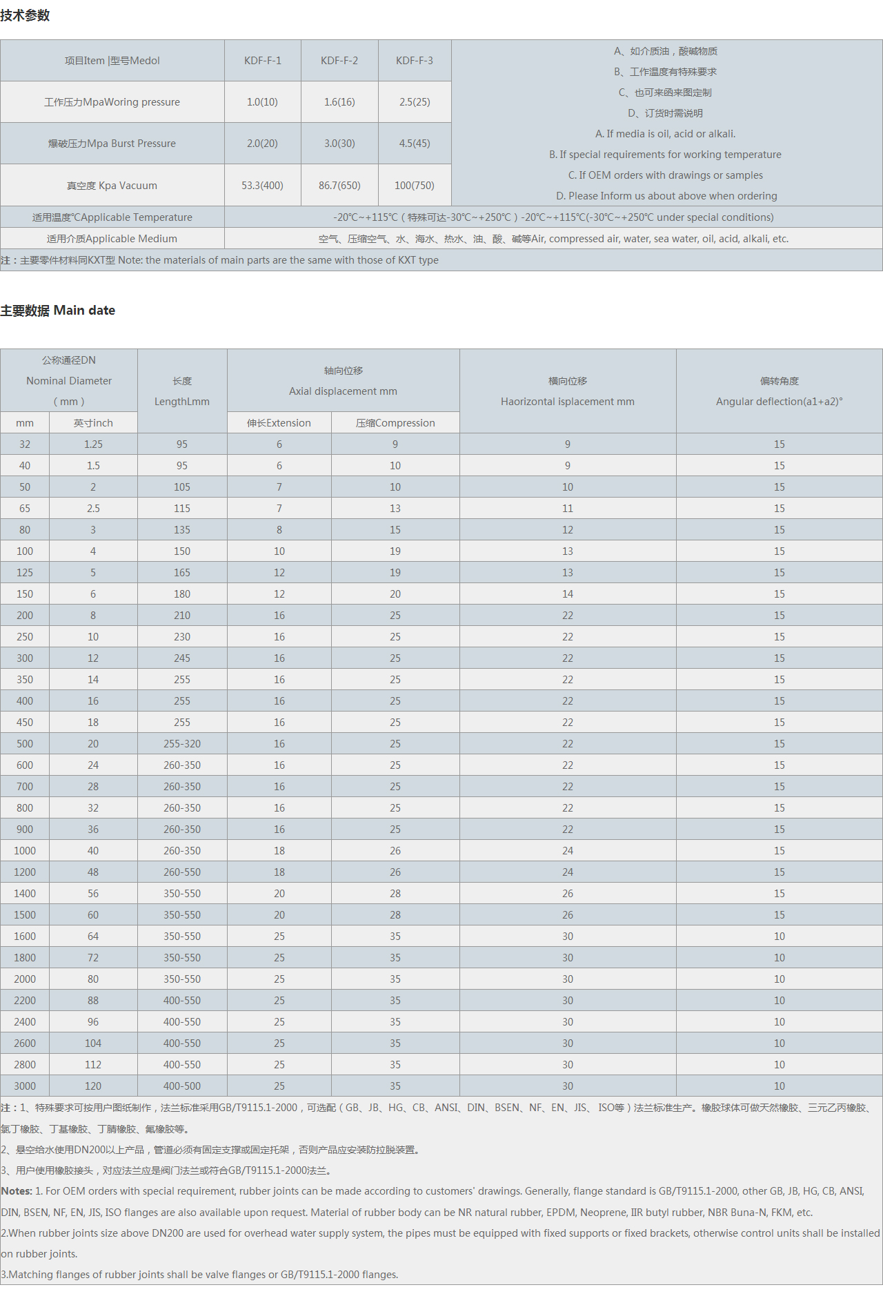 | 注:1、特殊要求可按用戶圖紙制作,可選配(GB、JB、HG、CB、ANSI、DIN、BSEN、NF、EN、JIS、 等)法蘭標(biāo)準(zhǔn)生產(chǎn)。橡膠球體可做天然橡膠、三元乙丙橡膠、氯丁橡膠、丁基橡膠、丁腈橡膠、氟橡膠等。 2、懸空給水使用DN200以上產(chǎn)品,管道必須有固定支撐或固定托架,否則產(chǎn)品應(yīng)安裝防拉脫裝置。 3、用戶使用橡膠接頭,對應(yīng)法蘭應(yīng)是閥門法蘭。 Notes: 1. For OEM orders with special requirement, rubber joints can be made according to customers' drawings. Generally, flange standard is , other GB, JB, HG, CB, ANSI, DIN, BSEN, NF, EN, JIS, flanges are also available upon request. Material of rubber body can be NR natural rubber, EPDM, Neoprene, IIR butyl rubber, NBR Buna-N, FKM, etc. 2.When rubber joints size above DN200 are used for overhead water supply system, the pipes must be equipped with fixed supports or fixed brackets, otherwise control units shall be installed on rubber joints. 3.Matching flanges of rubber joints shall be valve flanges or flanges. |